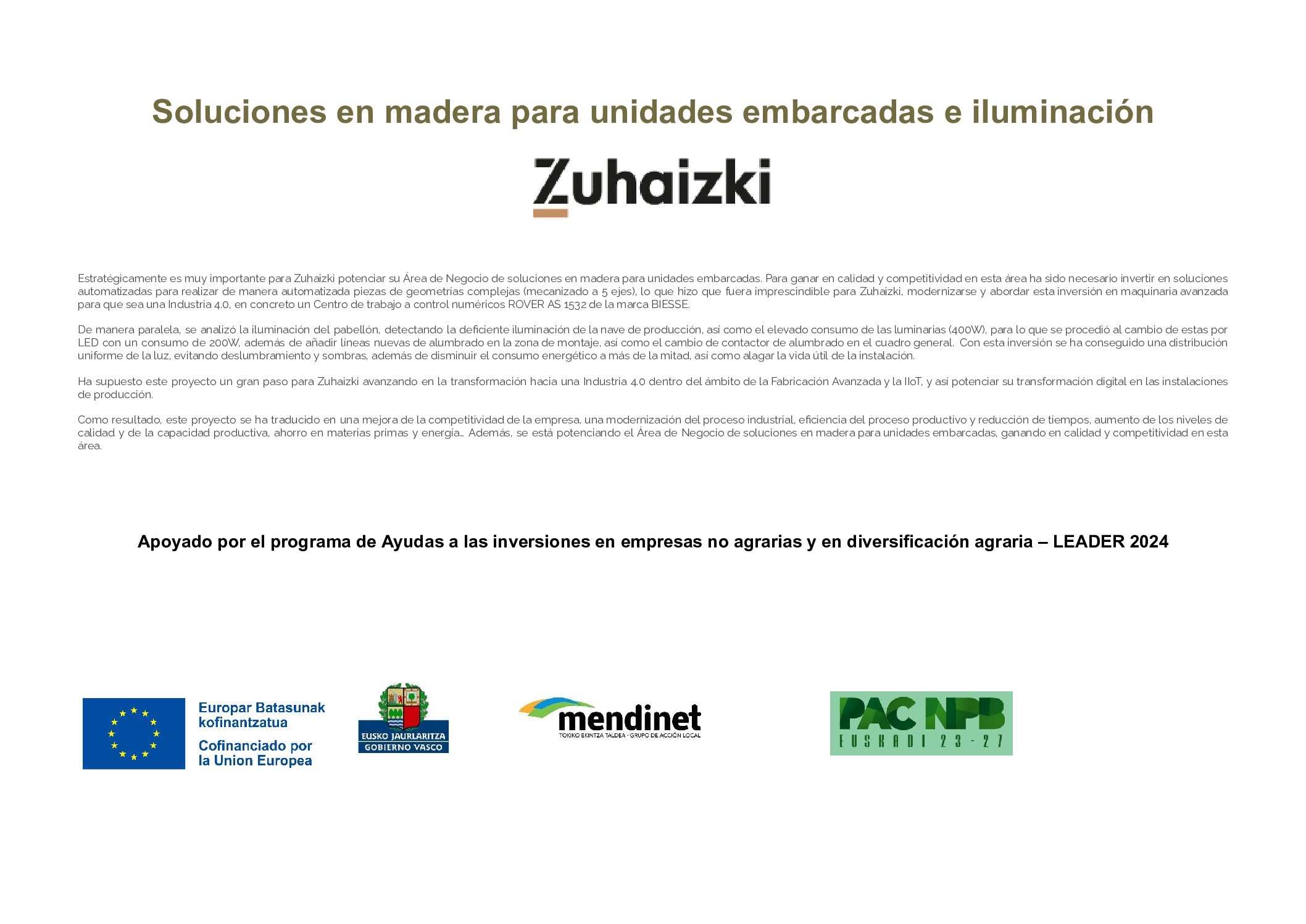 Estratégicamente es muy importante para Zuhaizki potenciar su Área de Negocio de soluciones en madera para unidades embarcadas. Para ganar en calidad y competitividad en esta área ha sido necesario invertir en soluciones automatizadas para realizar de manera automatizada piezas de geometrías complejas (mecanizado a 5 ejes), lo que hizo que fuera imprescindible para Zuhaizki, modernizarse y abordar esta inversión en maquinaria avanzada para que sea una Industria 4.0, en concreto un Centro de trabajo a control numéricos ROVER AS 1532 de la marca BIESSE.